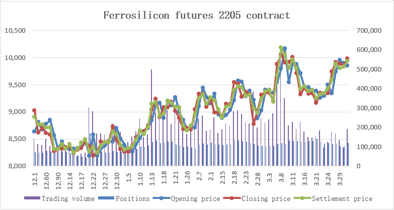 [Futures Market] The opening price of 2205 main contract of ferrosilicon futures in March was 9,028, the highest price was 10,450, the lowest price was 9,028, the closing price was 9,984, the settlement price was 9,938, the trading volume was 5,081,922, and the position was 118,897, an increase of 11.16%.