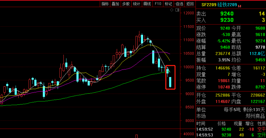 The weekly opening price of 2209 main contract was 9904, the highest price was 9984, the lowest price was 9224, the closing price was 9240, the settlement price was 9460, the trading volume was 446867, and the position was 146596, down 7.12%.
