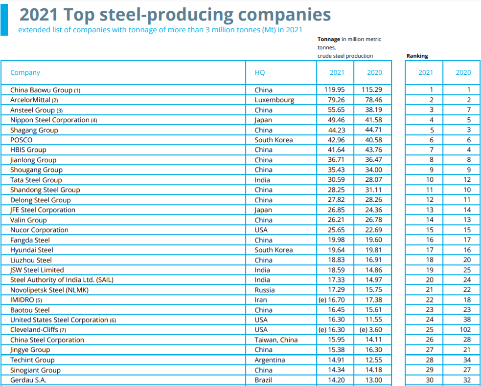 Delong Steel Group in 12th place (27.82 Mt), JFE Steel Corporation in 13th place (26.85 Mt).