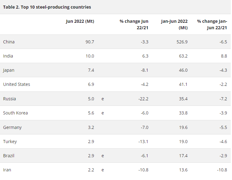 China produced 90.7 Mt in June 2022, down 3.3% on June 2021. India produced 10.0 Mt, up 6.3%. Japan produced 7.4 Mt, down 8.1%. The United States produced 6.9 Mt, down 4.2%. Russia is estimated to have produced 5.0 Mt, down 22.2%. South Korea is estimated to have produced 5.6 Mt, down 6.0%. Germany produced 3.2 Mt, down 7.0%. Turkey produced 2.9 Mt, down 13.1%. Brazil is estimated to have produced 2.9 Mt, down 6.1%. Iran is estimated to have produced 2.2 Mt, down 10.8%.