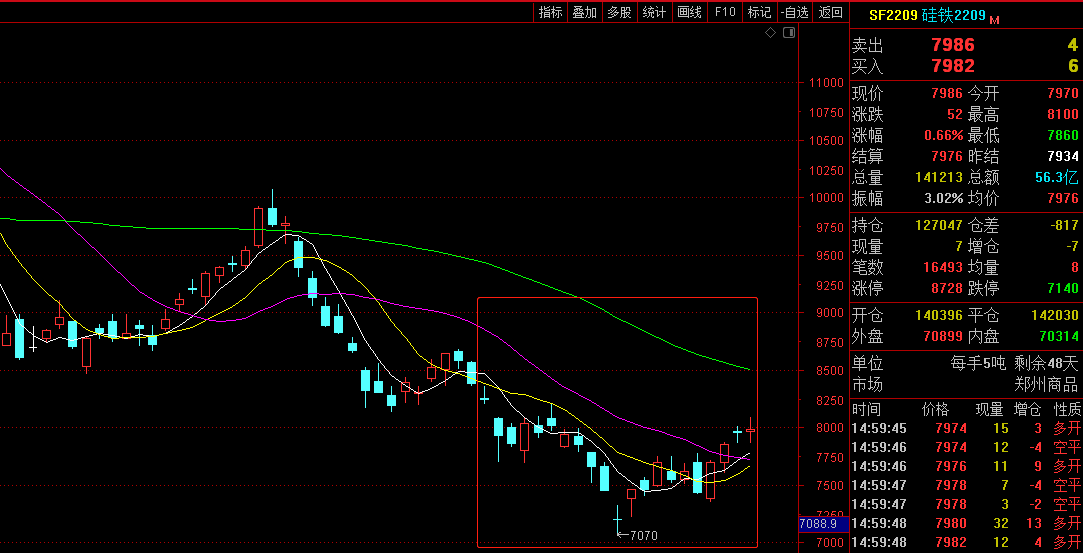 In July, the opening price of 2209 contract was 8,258, the highest price was 8,360, the lowest price was 7,070, the closing price was 7,986, the settlement price was 7,976, the trading volume was 3,641,937, and the position was 127,047, a decrease of 5.18%.