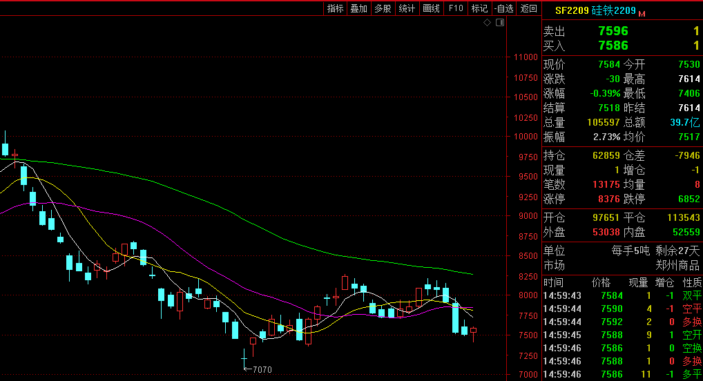 The weekly opening price of 2209 main contract was 8,100, the highest price was 8,184, the lowest price was 7,406, the closing price was 7,584, the settlement price was 7,518, the trading volume was 568,680, and the position was 62,819, down 6.46%.
