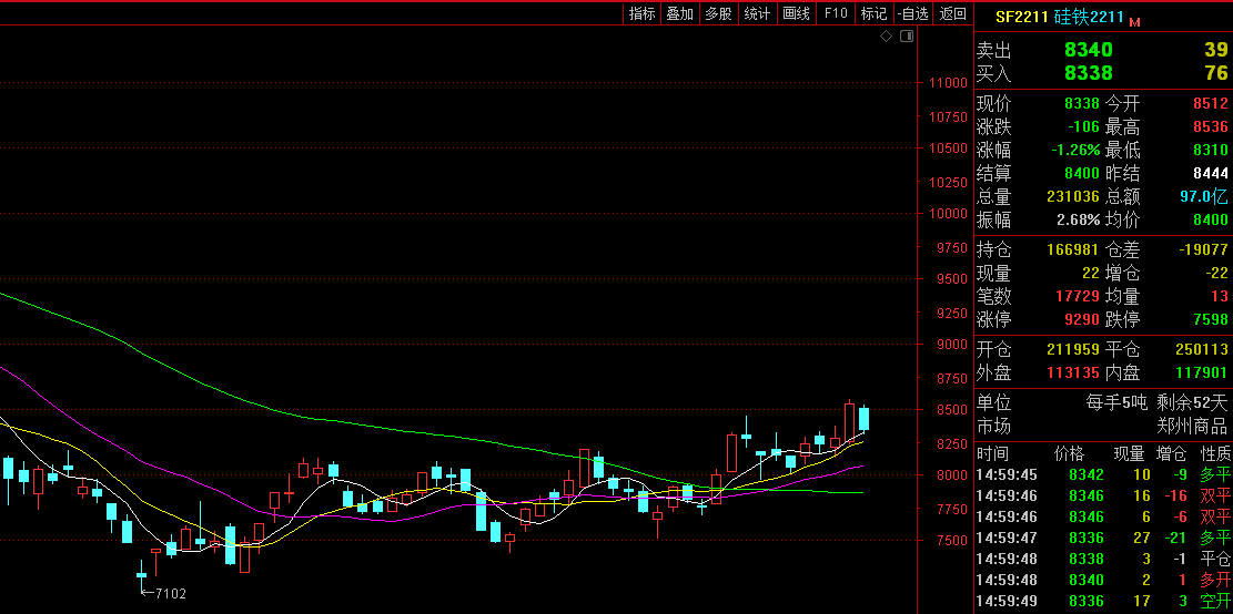 The weekly opening price of 2211 main contract was 8,150, the highest price was 8,586, the lowest price was 8,080, the closing price was 8,338, the settlement price was 8,400, the trading volume was 1,070,702, and the position was 166,981, up 3.60%.