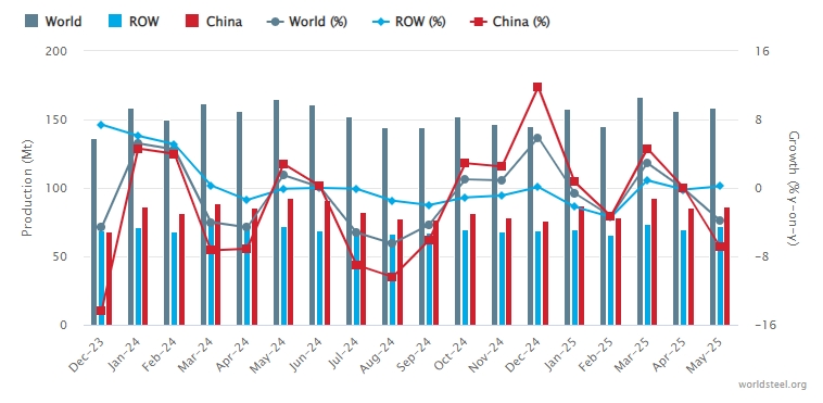 【Ferro-alloys.com】: World crude steel production for the 70 countries reporting to the World Steel Association (worldsteel) was 158.8 million tonnes (Mt) in May 2025, a 3.8% decrease compared to May 2024.