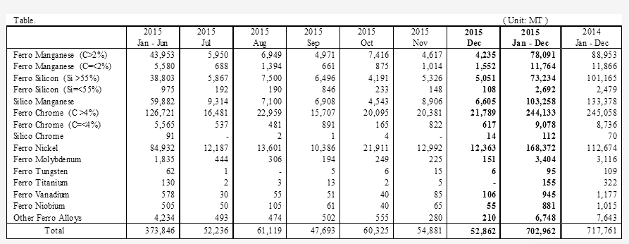 According to the import statistics of Taiwan, the import volume of major ferroalloys in the full year 2015 (January - December) was 702,962 tons, down by 2.1% from 717,761 tons in the prior year. |