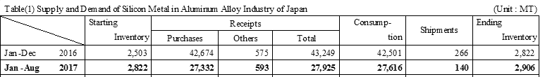 At the end of last week, Japan Aluminium Alloy Refiners Association announced the result of demand & supply for silicon metal and the production result of secondary aluminium alloy products in August 2017. |