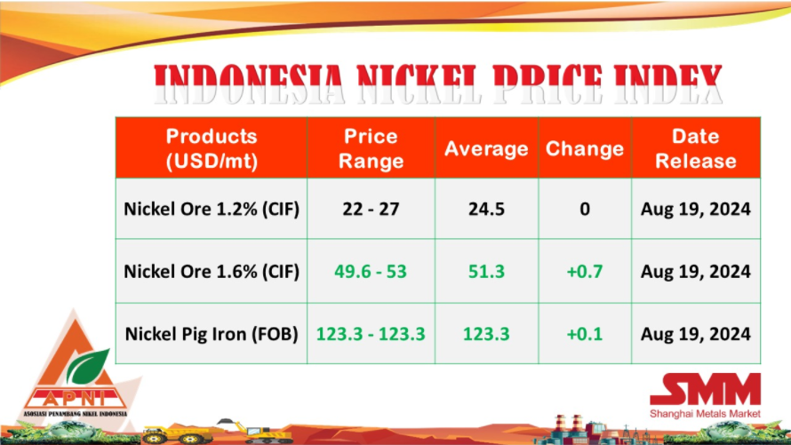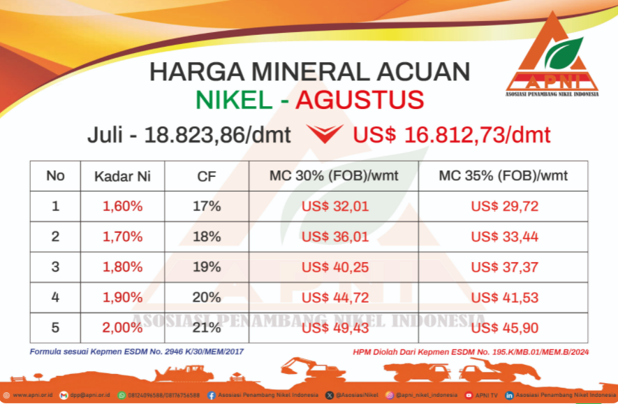 The Indonesian nickel miner association (APNI) has just released the Mineral price (HMA) of high nickel ore and of lower nickel ore for August 2024. |