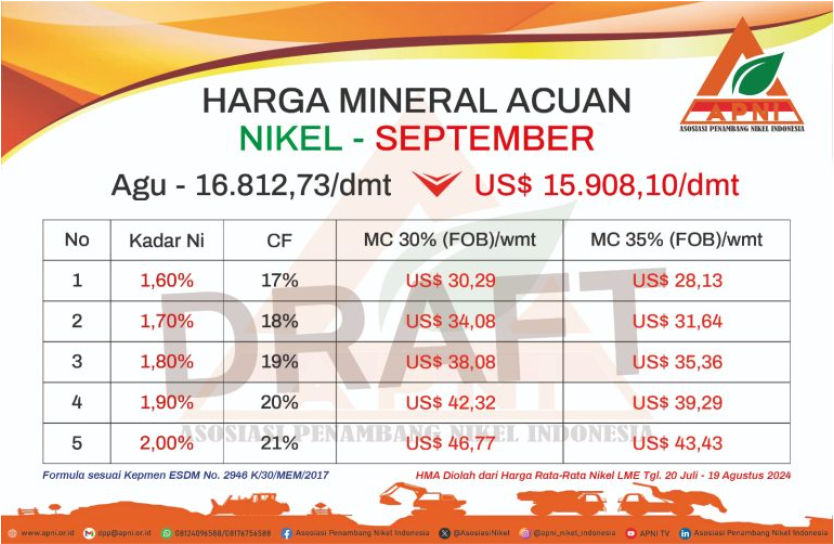 The Indonesian nickel miner association (APNI) has just released the Mineral price (HMA) of high nickel ore and of lower nickel ore for September 2024. |