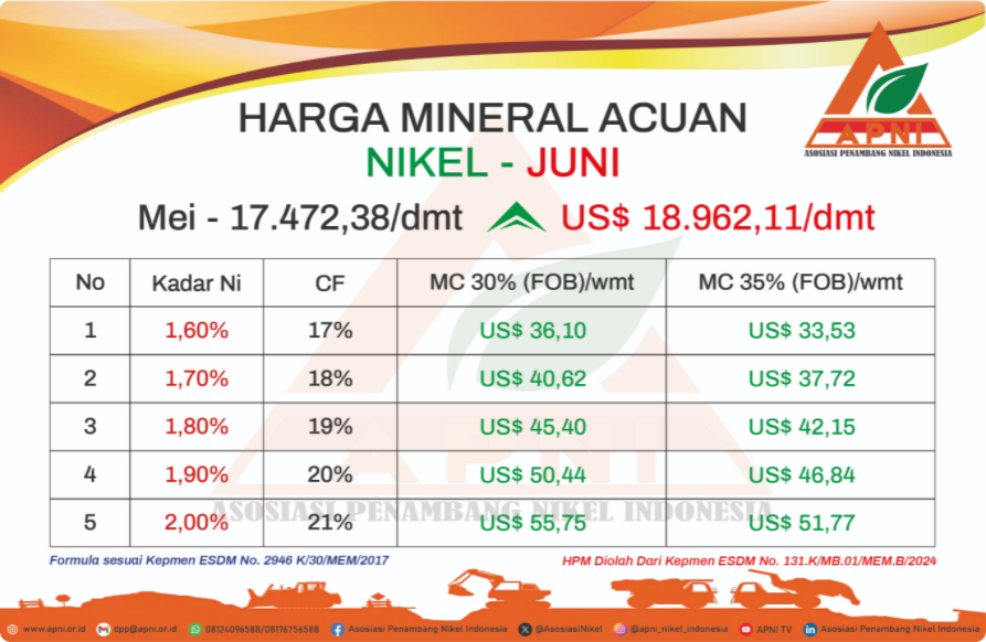 The Indonesian nickel miner association (APNI) has just released the Mineral price (HMA) of high nickel ore and of lower nickel ore for June 2024. |