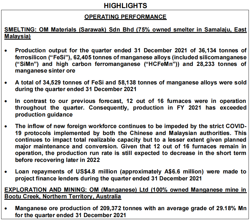 OM HOLDINGS December 2021 Quarterly Production and Market